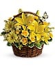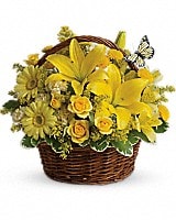 Wishes do come true, by the basketful, actually. This delightful arrangement is so full of sunny blossoms, it even includes a pretty yellow butterfly who obviously feels right at home, basking in the warmth.