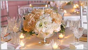 Orange flowers are perfect for fall ceremonies, and include peach or burnt-orange roses, dazzling dahlias and coral-hued gerberas. Ask for them in centerpieces, accented with tiny pumpkins and a curl of golden ribbon.